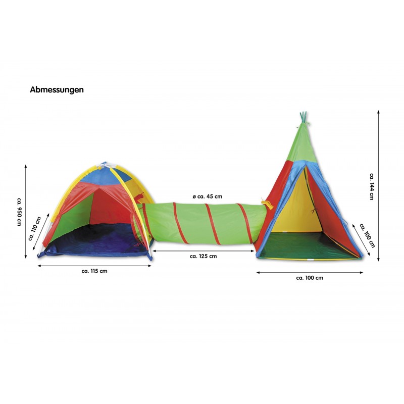 Μια ινδιάνικη σκηνή και μια σκηνή igloo, που ενώνονται με ένα τούνελ, για να γίνεται το παιχνίδι πιο διασκεδαστικό, πηγαίνοντας απ’ τη μία στην άλλη. Κατάλληλες για παιχνίδι μέσα στο σπίτι, αλλά και στον κήπο. Συναρμολογούνται εύκολα, είναι κατασκευασμένες από αδιάβροχο πολυστερικό ύφασμα κι ο σκελετός από fiberglass.