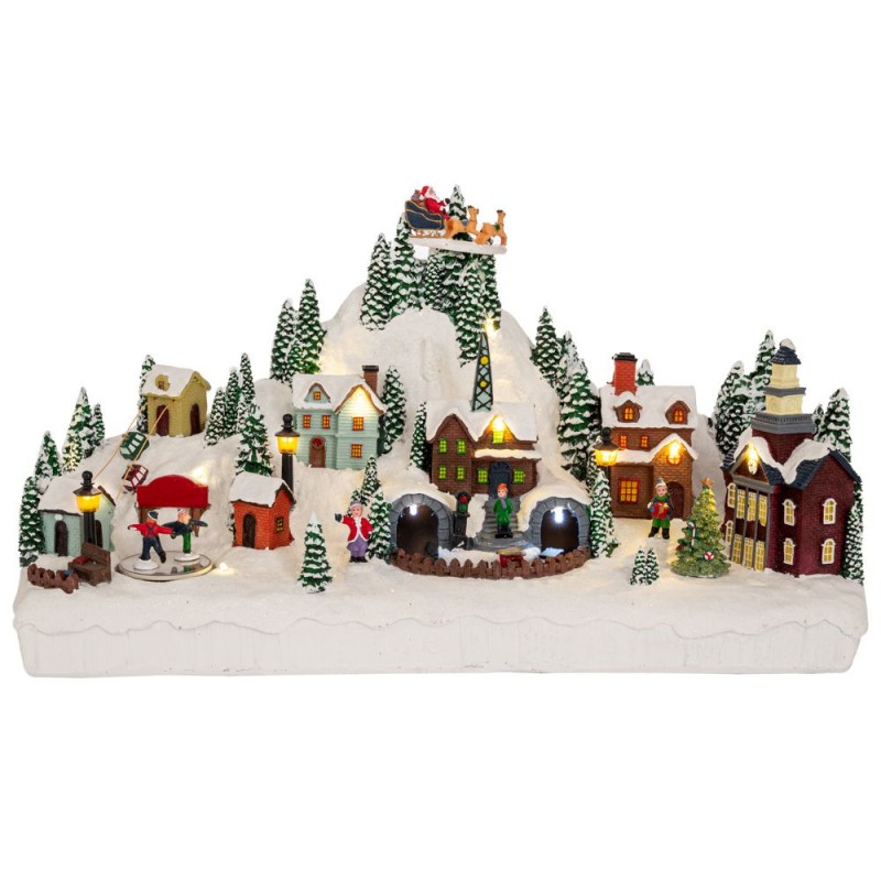 Χριστουγεννιάτικο φωτιζόμενο χωριό με σπιτάκια και τρένο που κινείται μέσα σε τούνελ. Τα παιδάκια γυρνάνε γύρω-γύρω και παίζει μουσική. Η μουσική έχει κουμπί On/Off. Λειτουργεί με ρεύμα με μετασχηματιστή 4.5V που περιέχεται. Υλικό κατασκευής πολυρεζίνη και πλαστικό. Πολύ καλή απεικόνιση και ποιότητα κατασκευής. Τo προιόν μπορεί να έχει μικρές χρωματικές διαφορές απο την φωτογραφία.