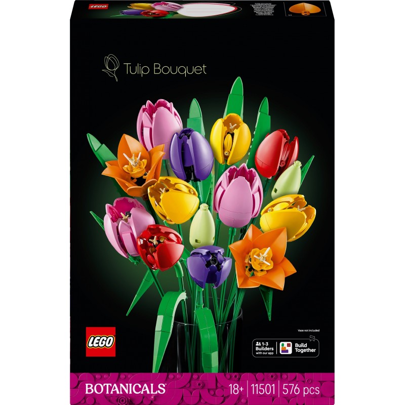 LEGO Botanical Tulip Bouquet (11501). Προσθέστε ένα πανέμορφο διακοσμητικό στο σπίτι σας με το σετ κατασκευής LEGO Botanical Tulip Bouquet (11501) για ενήλικες. Αυτό το LEGO μπουκέτο αποτυπώνει τη χαρά και την αισιοδοξία της άνοιξης με 5 ποικιλίες τουλιπών σε διάφορα χρώματα και στάδια άνθισης. Βυθιστείτε στην ομορφιά των λουλουδιών καθώς κατασκευάζετε έντονα πράσινα μπουμπούκια, μωβ κλειστές τουλίπες και κόκκινες, κίτρινες και ροζ ανοιχτές τουλίπες, και πράσινα φύλλα για μεγαλύτερη αυθεντικότητα. Το σετ κατασκευής λουλουδιών περιλαμβάνει επίσης ρυθμιζόμενους μίσχους που σας βοηθούν να τοποθετήσετε τις τουλίπες όπως θέλετε για να δημιουργήσετε ένα εξατομικευμένο LEGO μπουκέτο. Μόλις ολοκληρώσετε αυτό το διασκεδαστικό πρότζεκτ χειροτεχνίας, το σετ μετατρέπεται σε ένα εντυπωσιακό διακοσμητικό με λουλούδια που θα δώσει χρώμα σε κάθε χώρο. Αυτό το σετ κατασκευής λουλουδιών είναι υπέροχο δώρο για γυναίκες και άνδρες, για γενέθλια, την Ημέρα του Αγίου Βαλεντίνου, την Ημέρα της Μητέρας, τα καλορίζικα του σπιτιού ή οποιαδήποτε άλλη ειδική περίσταση, και είναι διαθέσιμο στην εφαρμογή LEGO Builder, όπου οι επίδοξοι ανθοκόμοι μπορούν να αποκτήσουν πρόσβαση σε ψηφιακές οδηγίες κατασκευής και να παρακολουθούν την πρόοδό τους. Το σετ περιέχει 576 τεμάχια.