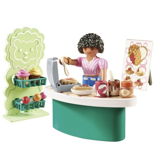 - Περίπτερο με γλυκά με φιγούρα PLAYMOBIL, ράφι με κρεμαστά καλάθια, πάγκο πώλησης, cupcakes, γλειφιτζούρια, καρδιά-ζαχαρωτό, βαφλιέρα και πολλά άλλα γλυκά αξεσουάρ.