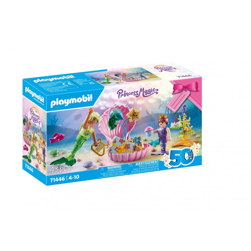 Ταξιδέψτε στον υποθαλάσσιο κόσμο της PLAYMOBIL! Αυτό το σετ, κατάλληλο για παιδιά ηλικίας 4 ετών και άνω, προσφέρει ατελείωτες ώρες διασκέδασης. Το γιγαντιαίο κοχύλι συνθέτει ένα υπέροχο σκηνικό για το πάρτι, όπου μπορείτε να τοποθετήσετε μπαλονάκια και δώρα. Τα μικρά κοχύλια "στερεώνονται" μαγικά σε λείες επιφάνειες. Τα κοραλλιογενή φύλλα είναι ένα τέλειο σημείο για κέικ και μάφινς. Οι γοργόνες μπορούν να κάθονται ή να στέκονται με την ουρά τους ανασηκωμένη. Με ειδικό ταμπελάκι για ευχές πάνω στο κουτί.