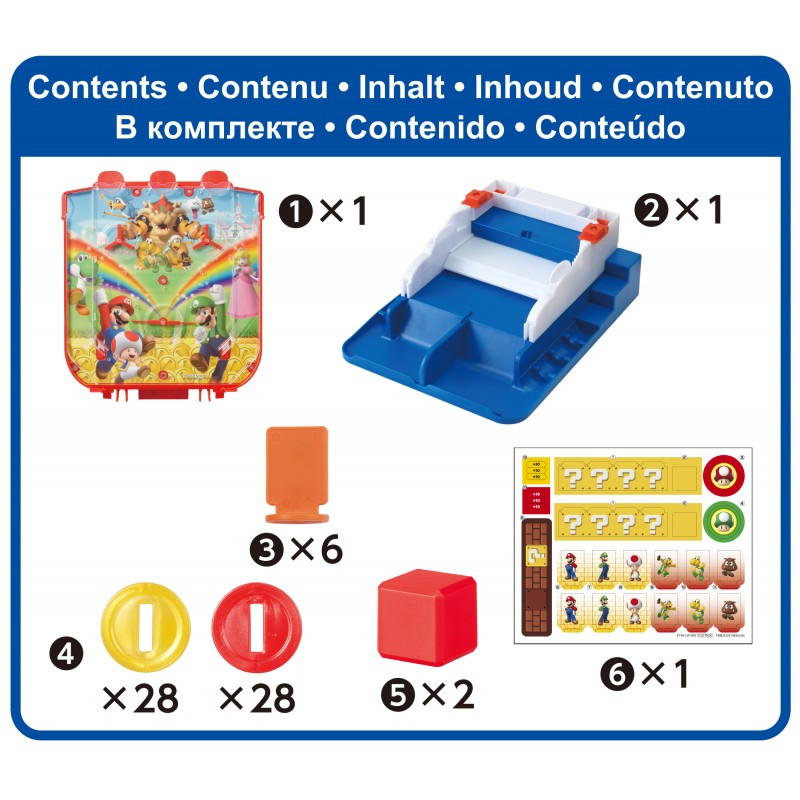 Ένα παιχνίδι ρίψης νομισμάτων που μπορεί να παίξουν ένα ή δύο άτομα. Τοποθετήστε νομίσματα και ρίξτε τους χαρακτήρες Mario στη διαφάνεια που κινείται εμπρός και πίσω. Ευκαιρίες μπόνους έρχονται ρίχνοντας το Hatena Block στη διαφάνεια στον δίσκο κερμάτων σας. Τα κέρματα μπόνους μπορούν να αφαιρεθούν. Ο πρώτος που ρίχνει όλους τους χαρακτήρες της ομάδας σας κερδίζει! Περιλαμβάνονται : 1 κύριο σώμα (πάνω), 1 κύριο σώμα (κάτω), 2 μπλοκ hatena, 56 νομίσματα, 6 κομμάτια χαρακτήρων, 1 φύλλο αυτοκόλλητου.