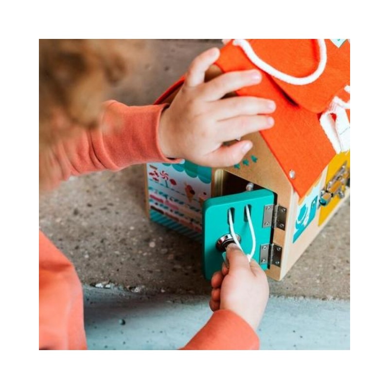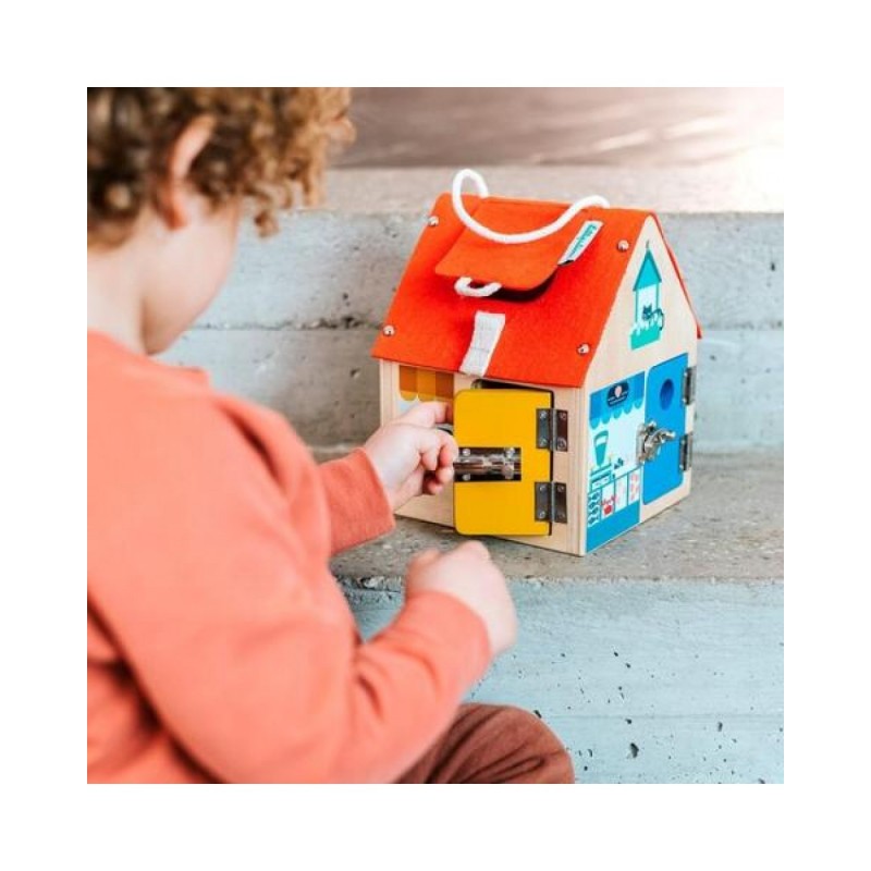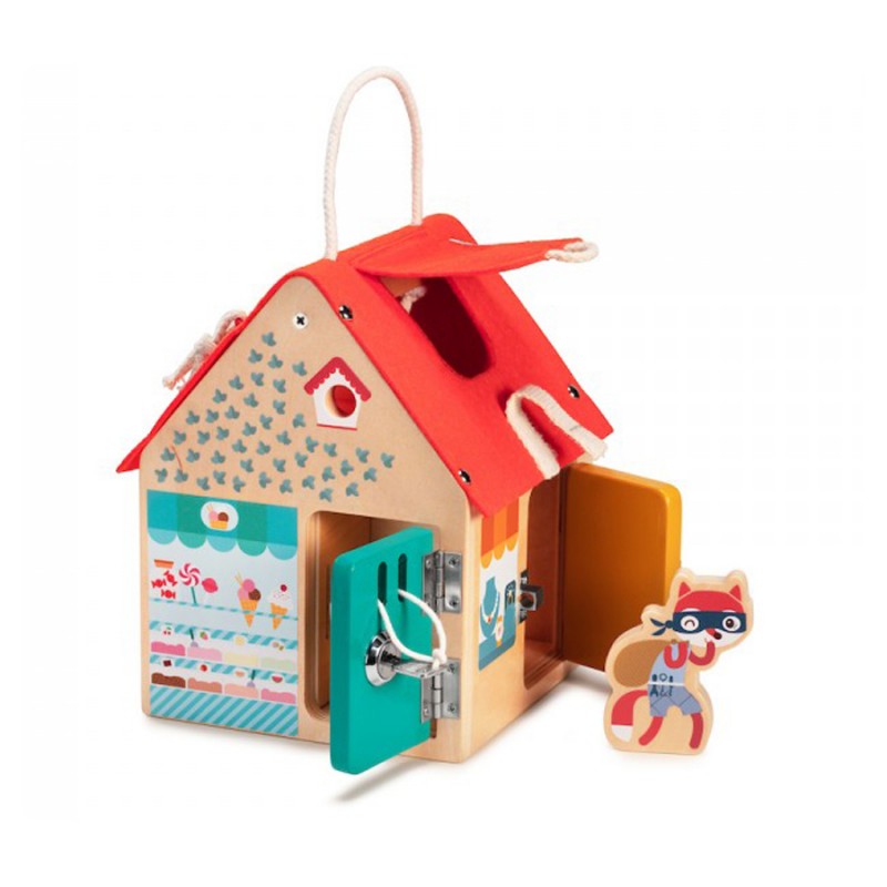 Προσοχή! Υπάρχει ένας κλέφτης που τριγυρνά το σπίτι. Ελέγξτε γρήγορα ότι όλες οι πόρτες και τα παράθυρα είναι κλειδωμένα. Ή μήπως θα γίνετε συνεργός του κλέφτη και θα αφήσετε κάτι ανοιχτό για να μπει; Με αυτό το σπίτι, τα παιδιά μαθαίνουν διαφορετικά συστήματα κλειδιών και κλειδαριών, τα οποία θα βελτιώσουν τη λεπτή τους κινητικότητα. Επιπλέον, με το σχεδιασμό του σπιτιού και τον χαρακτήρα του κλέφτη, μπορείτε να φανταστείτε και να δημιουργήσετε ιστορίες, αφήνοντας τη φαντασία σας να τρέξει ελεύθερη, και να περάσετε ώρες παίζοντας και μαθαίνοντας!