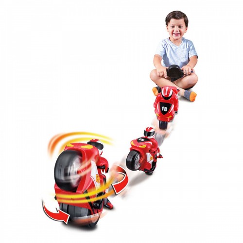 Μια μοτοσικλέτα για μικρά παιδιά από την εταιρία BB Junior. Μια τηλεκατευθυνόμενη μοτοσικλέτα με την οποία μπορείτε να γυρίσετε το τιμόνι και αυτή θα στρίψει αριστερά-δεξιά. Επιπλέον οδηγεί προς τα εμπρός και προς τα πίσω. Περιλαμβάνει ένα κουμπί περιστροφής & stunt με μελωδίες από την εταιρία Burago. Προωθεί το ευφάνταστο παιχνίδι και το συντονισμό χεριού-ματιού. Περιλαμβάνει μπαταριές 3xΑAA για το χειριστήριο ,απαιτούνται μπαταρίες για την μοτοσικλέτα 4xΑΑ.