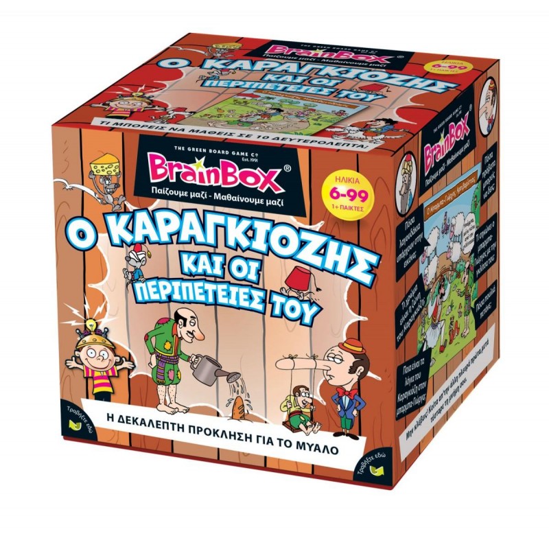 Αυτό το συναρπαστικό BrainBox με κεντρικό ήρωα τον διαχρονικό, λαϊκό και ασυμβίβαστο Καραγκιόζη, παρουσιάζει στιγμές από τις καθημέρινες ξεκαρδιστικές περιπέτειες που περνά αλλά και προκαλεί και στους υπόλοιπους ήρωες του Θεάτρου Σκιών. Με χαρακτηριστικά το αστήρευτο και πρωτότυπο χιούμορ και τη σατιρική διάθεση που διακρίνει τον αγαπημένο καμπούρη της λαϊκής μας παράδοσης Καραγκιόζη θέλει να μας περάσει το μήνυμα ότι το χιούμορ είναι απαραίτητο στοιχείο στη ζωή για να διατηρούμε την αισιοδοξία μας στις περιπέτειες που μπορεί να τύχουν σε όλους μας. Σχεδιασμένο για να παίζουν οι γονείς με τα παιδιά τους, αυτό το υπέροχο παιχνίδι θα βοηθήσει στη βελτίωση της παρατηρητικότητας και των μνημονικών ικανοτήτων. Σκοπός του παιχνιδιού: Μάζεψε τις περισσότερες κάρτες μέσα σε 10 λεπτά.