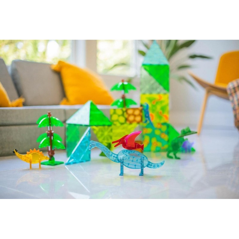To σετ δεινοσαύρων Magna-Tiles Dino World XL περιλαμβάνει έξι μαγνητικούς δεινόσαυρους :Pteranodon, T-Rex, Stegosaurus, Triceratops, Velociraptor και Brachiosaurus. Τα μεγέθη των δεινοσαύρων ποικίλλουν από 3″ έως και 7,5″ .Κάθε δεινόσαυρος έχει κινητά μέρη έτοιμα για δράση και ατελείωτο παιχνίδι. Το σετ περιλαμβάνει επίσης 16 μεγάλα μαγνητικά πλακίδια (4 φορές μεγαλύτερα από τα παραδοσιακά μαγνητικά πλακίδια) καθώς και τα πρώτα, επεκτεινόμενα μαγνητικά δέντρα με πλούσια, μαγνητικά φύλλα!
