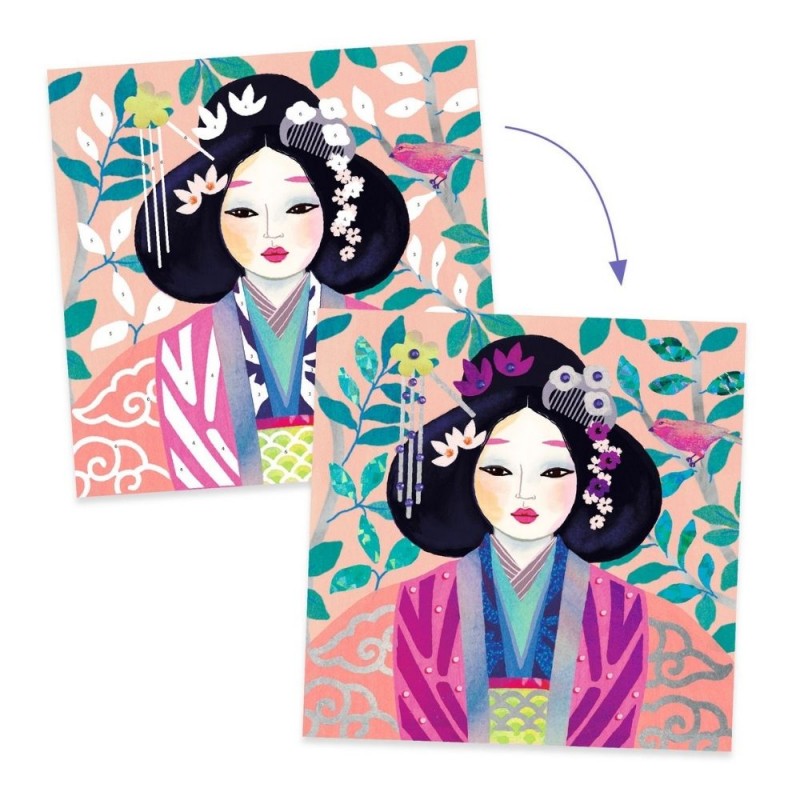 Ακολουθήστε τις οδηγίες βήμα – βήμα και διακοσμήστε 4 εικόνες με χρωματιστά φύλλα χρυσού και αυτοκόλλητα πετράδια! Οι εικόνες ξεχωρίζουν χάρη στην ιδιαίτερη εικονογράφηση της εταιρίας Djeco και αναπαριστούν 4 κορίτσια με παραδοσιακές στολές διαφορετικών εθνικοτήτων! Το μεταλλικό εφέ και τα τρισδιάστατα πετράδια προσδίδουν ένα εντυπωσιακό τελικό αποτέλεσμα που μπορεί να αποτελέσει ιδανική επιλογή για το στολισμό του παιδικού δωματίου. Μία ευχάριστη δραστηριότητα που συμβάλλει στη συγκέντρωση, τη παρατηρητικότητα και την ανάπτυξη της λεπτή κινητικότητας των παιδιών, ενώ παράλληλα καλλιεργεί την φαντασία, την επιμονή και την αυτοπεποίθηση τους. Το σετ περιλαμβάνει 4 κάρτες προς συμπλήρωση, 33 μεταλιζέ φύλλα σε διαφορετικά χρώματα, 4 φύλλα με αυτοκόλλητα πετράδια και εικονογραφημένες οδηγίες.