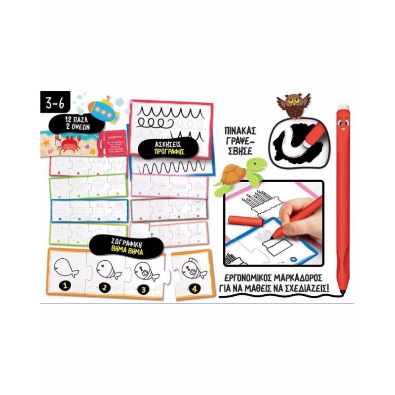 Φτιάξε τις πρώτες σου ζωγραφιές με τη βοήθεια των 12 παζλ και μάθε να κρατάς σωστά το μολύβι! Το Montessori Pen δημιουργήθηκε από ανατομικές μελέτες, για σωστή εργονομία και ειδικές υποδοχές για τα δάχτυλα που επιτρέπουν τη σωστή λαβή (ταιριάζει και σε αριστερόχειρες). Μακροπρόθεσμα, η λάθος λαβή του μολυβιού οδηγεί σε ανισορροπία της στάσης του σώματος. Επιπλέον, αν το μολύβι κρατηθεί με λάθος τρόπο, η δύναμη για την παραγωγή έργου αυξάνεται, χρησιμοποιώντας και μύες που δεν χρειάζονται εκείνη τη στιγμή. Αυτό θα δημιουργήσει μεγαλύτερη κόπωση στο παιδί, που θα έχει την τάση να κουράζεται εύκολα. Περιλαμβάνει εργονομικό μαρκαδόρο με καπάκι και σφουγγαράκι , 12 παζλ , 3 πινακες 2 όψεων και Οδηγίες