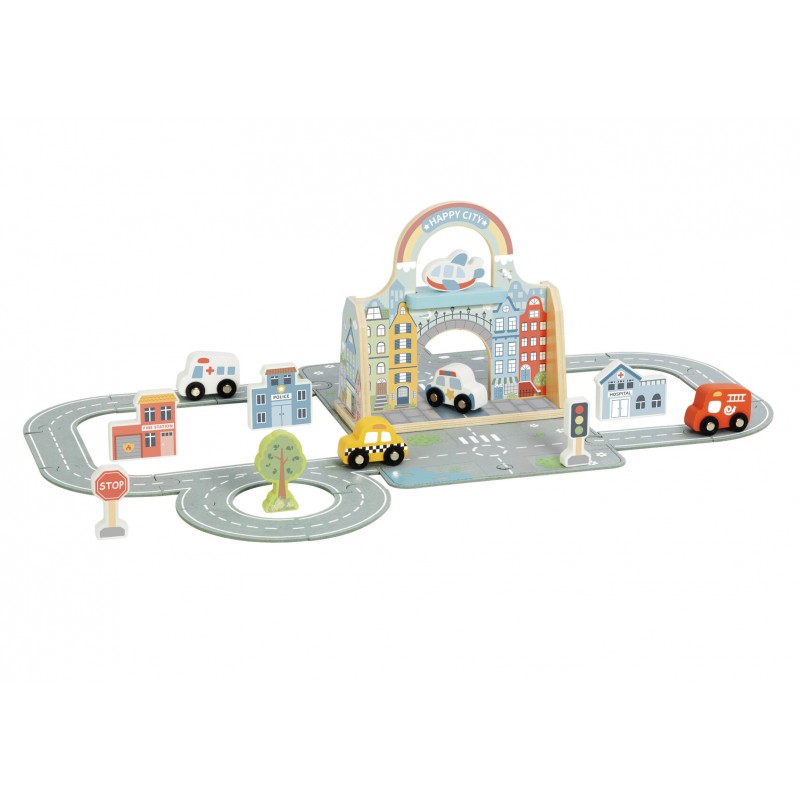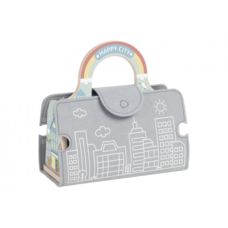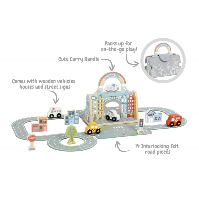 Εξερευνήστε, κατασκευάστε και φανταστείτε με το Felt City Play Set, ένα πτυσσόμενο σετ παιχνιδιού που ζωντανεύει έναν ολόκληρο μικροσκοπικό κόσμο. Αυτό το έξυπνο σετ ανοίγει σε ένα μαλακό χαλάκι πόλης από τσόχα και περιλαμβάνει 14 αλληλοσυνδεόμενα κομμάτια δρόμου από τσόχα που μπορούν να αναδιαμορφωθούν σε ατελείωτες διατάξεις. Τα παιδιά μπορούν να σχεδιάσουν τους δικούς τους δρόμους και γειτονιές και στη συνέχεια να τους ζωντανέψουν με 4 οχήματα και 7 ξύλινες φιγούρες πόλης, συμπεριλαμβανομένων κτιρίων και δέντρων. Ιδανικό για αφήγηση ιστοριών και δημιουργικό παιχνίδι, το Felt City Play Set ενθαρρύνει τα παιδιά να εξερευνήσουν πώς λειτουργεί μια πολύβουη πόλη. Μπορούν να οδηγούν οχήματα κατά μήκος των δρόμων από τσόχα, να στήνουν κτίρια, να δημιουργούν πάρκα και να εφευρίσκουν πολυσύχναστες σκηνές πόλης - είτε στο σπίτι είτε εν κινήσει. Όταν τελειώσει ο χρόνος παιχνιδιού, όλα τα κομμάτια διπλώνονται τακτοποιημένα πίσω στη θήκη και το κεντρικό ξύλινο μπλοκ πόλης μετατρέπεται έξυπνα σε λαβή μεταφοράς, καθιστώντας αυτό το σετ ιδανικό για φορητή διασκέδαση. Συμπαγές, τακτοποιημένο και εύκολο στη μεταφορά οπουδήποτε, είναι ιδανικό για ταξίδια και γρήγορο παιχνίδι. Κατασκευασμένο από ξύλο πιστοποιημένο από FSC με λείες άκρες και φινιρίσματα ασφαλή για παιδιά, μη τοξικά, το Felt City Play Set είναι ανθεκτικό, ασφαλές και σχεδιασμένο για πρακτική ανακάλυψη. Αυτό το απολαυστικό σετ "όλα σε ένα" υποστηρίζει τις λεπτές κινητικές δεξιότητες, τη φαντασία, την επίλυση προβλημάτων και το ανεξάρτητο παιχνίδι—ιδανικό για νήπια και παιδιά προσχολικής ηλικίας που λατρεύουν να δημιουργούν τους δικούς τους μικρούς κόσμους.
