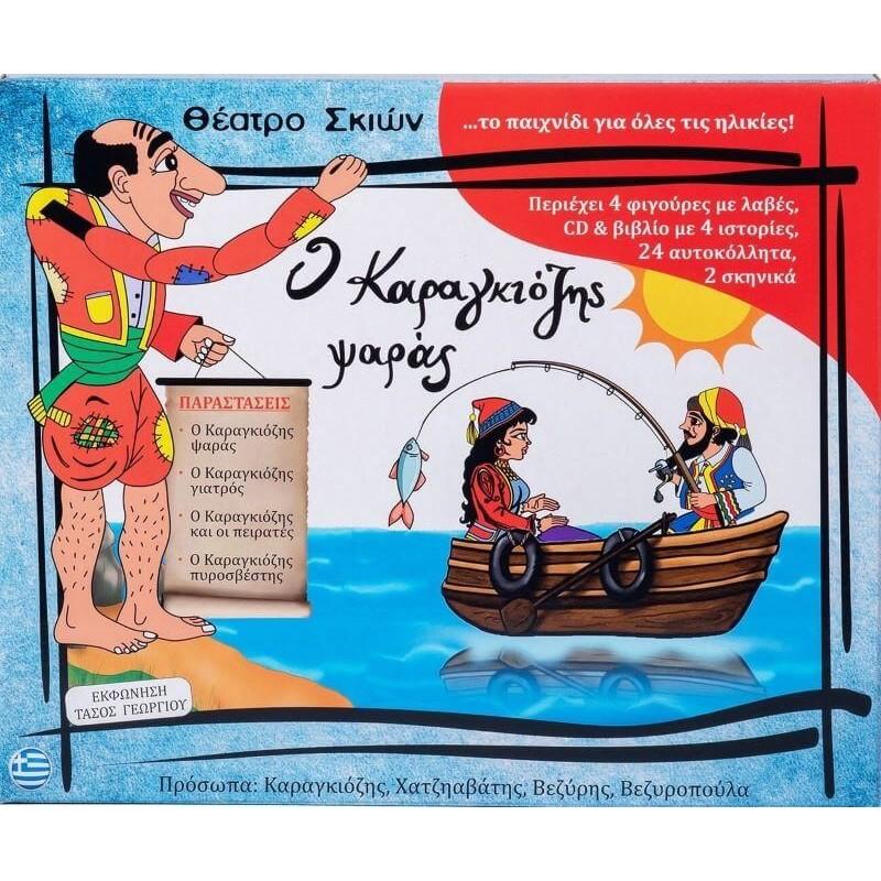 Το σετ περιλαμβάνει 4 συλλεκτικές πλαστικές φιγούρες θεάτρου σκιών (Καραγκιόζης, Χατζιαβάτης, Βεζύρης, Βεζυροπούλα), 2 σκηνικά απαραίτητα για τις παραστάσεις, 24 αυτοκόλλητα με όλους τους ήρωες της σειράς «Ο Καραγκιόζης και η παρέα του», CD με 4 ηχογραφημένες παραστάσεις καθώς και βιβλίο με τα κείμενα.
