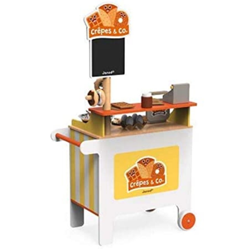 Για να φτιάξεις ωραίες κρέπες, χρειάζεσαι έναν εύκολο στη μετακίνηση πάγκο! Αυτός ο χαριτωμένος πάγκος για κρέπες και βάφλες έχει ότι χρειάζεσαι για να γίνεις ένας μικρός σεφ! Τα παιδιά σας, παριστάνοντας τους μικροπωλητές που πωλούν βάφλες και ντόνατ, θα αναπτύξουν τη φαντασία τους και θα ενισχύσουν τις κινητικές τους ικανότητες. Ο μαυροπίνακας στην μπροστινή όψη αναφέρει τις ώρες λειτουργίας και τις σπεσιαλιτέ της ημέρας! Περιλαβμάνει 40 εξαρτήματα: 1 ταμειακή μηχανή, 1 σετ με νομίσματα και χαρτονομίσματα, 1 βαφλιέρα, 3 βάφλες, 3 ντόνατ, 1 κουτί με 4 αυγά, 1 βάζο με επικάλυψη, 3 κρέπες, 3 γεμίσεις για τις κρέπες, 1 μπολ, 1 χτυπητήρι, 1 κουτάλα κρέπας, 9 κομμάτια φρούτα, 1 ζευγάρι λαβίδες, 3 χάρτινες σακούλες, 2 κουτιά από χαρτόνι και 1 κουτί με κιμωλίες.