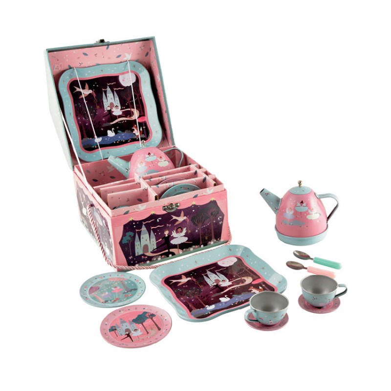 Αυτό δεν είναι απλά ένα ακόμα σετ τσαγιού… Είναι ένα σετ τσαγιού που παίζει μουσική όταν σερβίρεις το τσάι! Μπαλαρίνες και κύκνοι πρωταγωνιστούν στο πανέμορφα διακοσμημένο Μαγεμένο σετ τσαγιού. Φανταστείτε να κάνετε πάρτι τσαγιού και να ακούτε τη Λίμνη των Κύκνων κουρδίζοντας την τσαγιέρα και γεμίζοντας τα φλιτζάνια! Το σετ τσαγιού περιέχει μια μουσική τσαγιέρα , 1 δίσκο, 2 κουταλάκια, 2 φλιτζάνια με τα πιατάκια τους και 2 πιάτα. Χρησιμοποιήστε το κουρδιστήρι στον πάτο της τσαγιέρας για να παίξει μουσική!