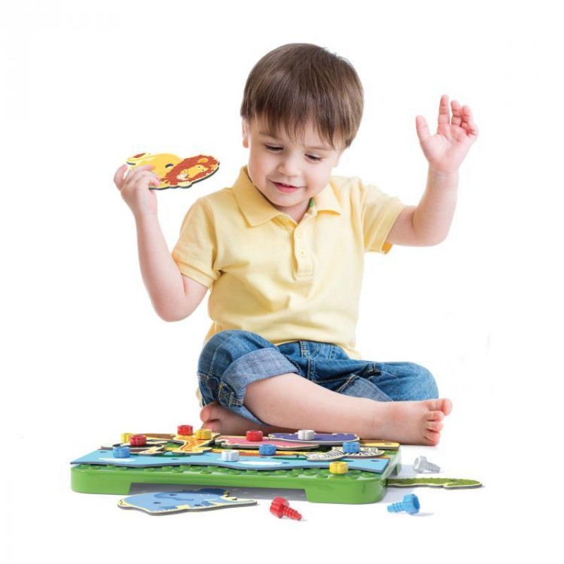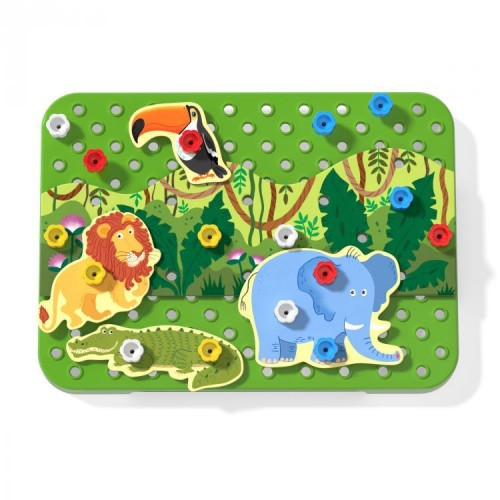 Αυτό είναι ένα νέο παιχνίδι με βίδες για να δημιουργήσεις νέες και συναρπαστικές σκηνές. Είναι εύκολο και διασκεδαστικό να μετακινήσετε τα άγρια ζώα από το ένα μέρος στο άλλο. Μπορείτε να τα βιδώσετε στον πίνακα δημιουργώντας ένα σκηνικό ζούγκλας, στη συνέχεια να τα ξεβιδώστε και να τα μεταφέρετε στη σαβάνα - μόνο με τη χρήση μιας βίδα, με μεγάλο κεφάλι ώστε να είναι εύκολο στο πιάσιμο. Αυτή η δραστηριότητα βοηθά στην ανάπτυξη χειρωνακτικής επιδεξιότητας: το παιδί πρέπει να βρει τις τρύπες στον πίνακα που αντιστοιχούν με αυτές που στις εικονογραφήσεις. Η τοποθέτηση και το βίδωμα είναι εύκολο, και δεν υπάρχει καμία ανάγκη για εργαλεία. Ενισχύει τη λογική: η ζέβρα και το λιοντάρι πρέπει να διατηρούνται χωριστά, ακριβώς για να είναι ασφαλή. Και επίσης διεγείρει τη φαντασία: η στρουθοκάμηλος θα μπορούσε να πάει στη ζούγκλα για να μιλήσει με έναν ελέφαντα...!