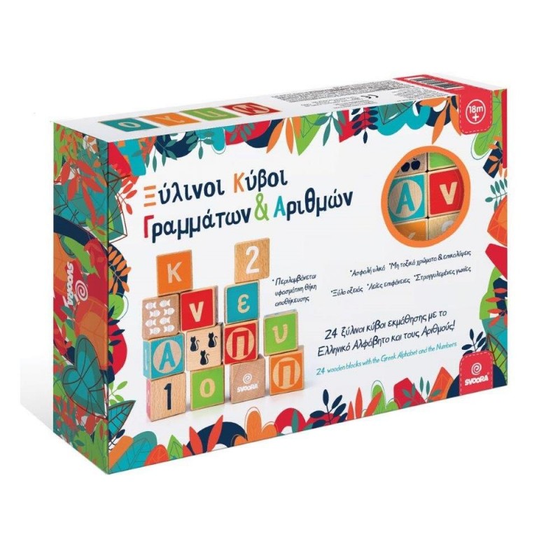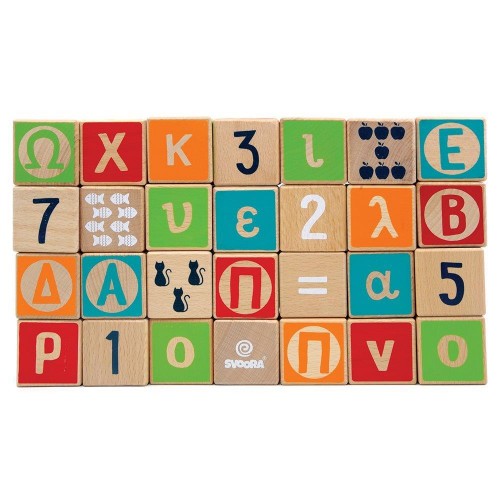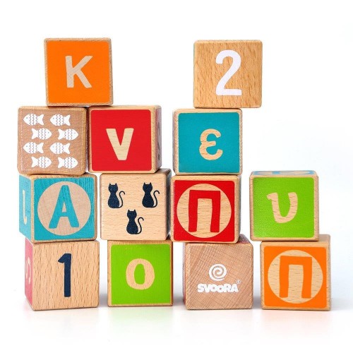 Το πλήθος ανά γράμμα της αλφάβητου έχει μελετηθεί ώστε να δίνει τον μέγιστο αριθμό λέξεων. Τα παιδιά μαθαίνουν επίσης τους αριθμούς και εξοικειώνονται με τις αριθμητικές πράξεις και τα σύμβολα. Οι 24 ξύλινοι κύβοι είναι και ένα κλασσικό παιχνίδι όταν χρησιμοποιούνται σαν τουβλάκια στοίβαξης με ποικίλους δημιουργικούς τρόπους! Η Ελληνική εταιρεία Svoora περιλαμβάνει στην συσκευασία και μια πρακτική υφασμάτινη θήκη αποθήκευσης. Κατάλληλο για παιδιά από 1,5 έως 4 ετών.