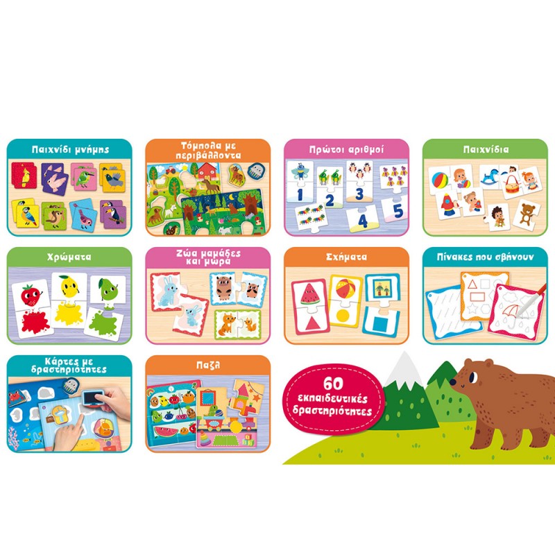 - 60 Εκπαιδευτικές Δραστηριότητες: Περιλαμβάνει τόμπολα, παζλ, λογικούς συσχετισμούς, παιχνίδια μνήμης, σετ ζωγραφικής και πολλά άλλα.