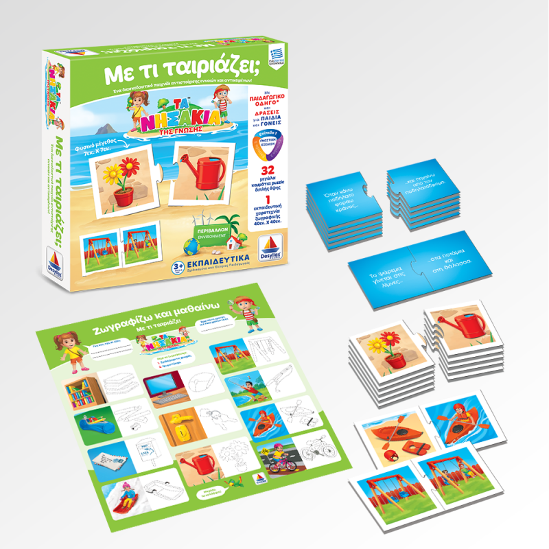Ένωσε τα ζευγάρια και ταίριαξε τη βιβλιοθήκη µε τα βιβλία της ή τον υπολογιστή µε το ποντίκι του! Τι από αυτά µπορείς να βρεις γύρω σου; Περιέχει και εκπαιδευτική χειροτεχνία, µε την οποία τα παιδιά ζωγραφίζοντας και δηµιουργώντας θα εµπεδώσουν τα αντικείµενα του παιχνιδιού!