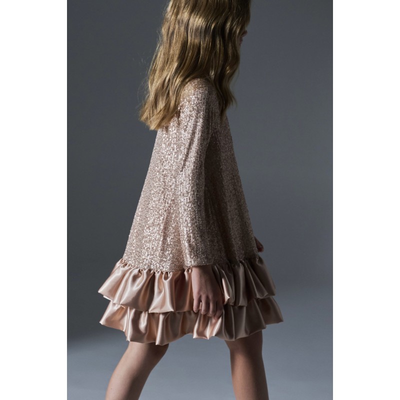 Αναδείξτε κάθε γιορτινή ή ξεχωριστή εμφάνιση με αυτό το εντυπωσιακό παιδικό φόρεμα με παγιέτες! Παγιέτες σε όλη την επιφάνεια και λαμπερό σατέν βολάν στο τελείωμα, προσφέροντας μοναδικό στυλ και άνεση. Το φόρεμα έχει μακριά μανίκια και ελαφρώς φαρδιά γραμμή, ώστε να επιτρέπει ελευθερία κινήσεων και να είναι άνετο στη χρήση.