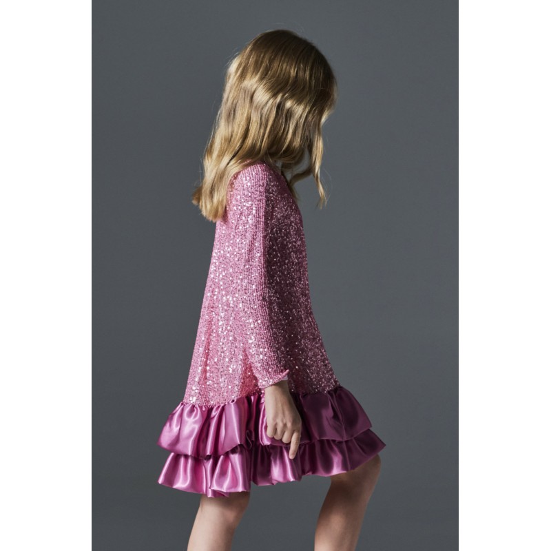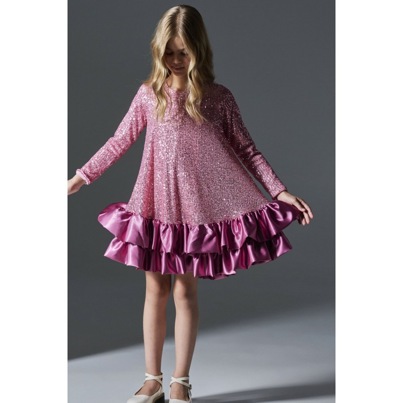 Αναδείξτε κάθε γιορτινή ή ξεχωριστή εμφάνιση με αυτό το εντυπωσιακό παιδικό φόρεμα με παγιέτες! Παγιέτες σε όλη την επιφάνεια και λαμπερό σατέν βολάν στο τελείωμα, προσφέροντας μοναδικό στυλ και άνεση. Το φόρεμα έχει μακριά μανίκια και ελαφρώς φαρδιά γραμμή, ώστε να επιτρέπει ελευθερία κινήσεων και να είναι άνετο στη χρήση.