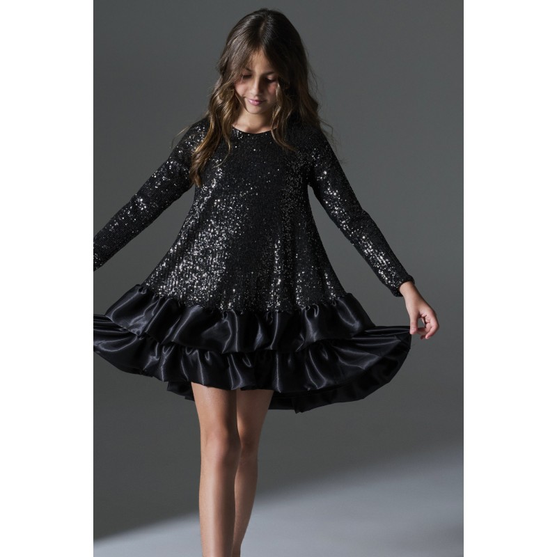 Αναδείξτε κάθε γιορτινή ή ξεχωριστή εμφάνιση με αυτό το εντυπωσιακό παιδικό φόρεμα με παγιέτες! Παγιέτες σε όλη την επιφάνεια και λαμπερό σατέν βολάν στο τελείωμα, προσφέροντας μοναδικό στυλ και άνεση. Το φόρεμα έχει μακριά μανίκια και ελαφρώς φαρδιά γραμμή, ώστε να επιτρέπει ελευθερία κινήσεων και να είναι άνετο στη χρήση.